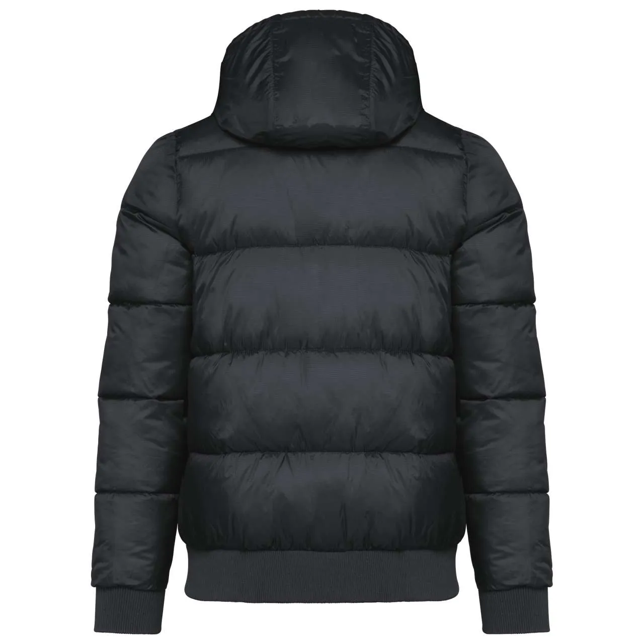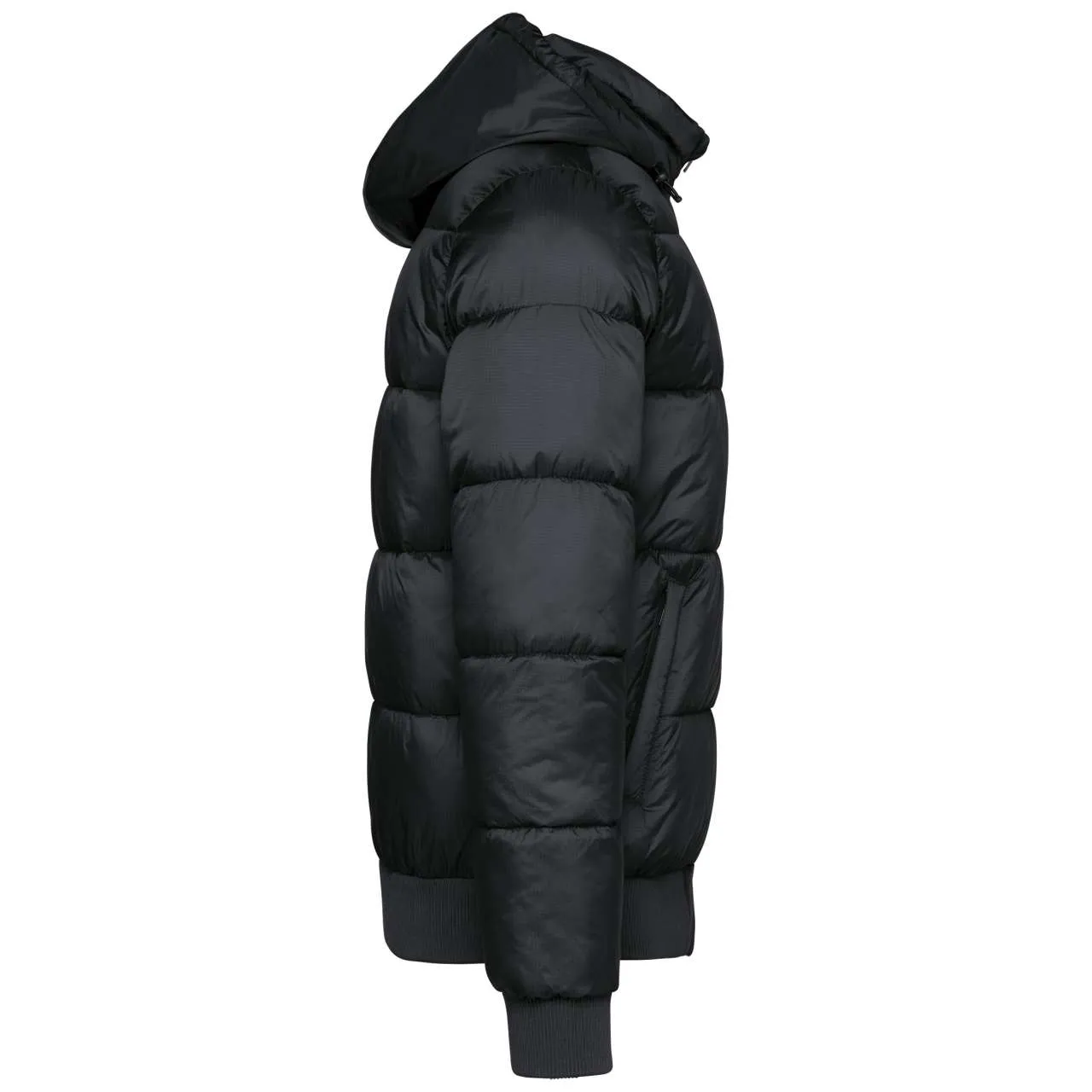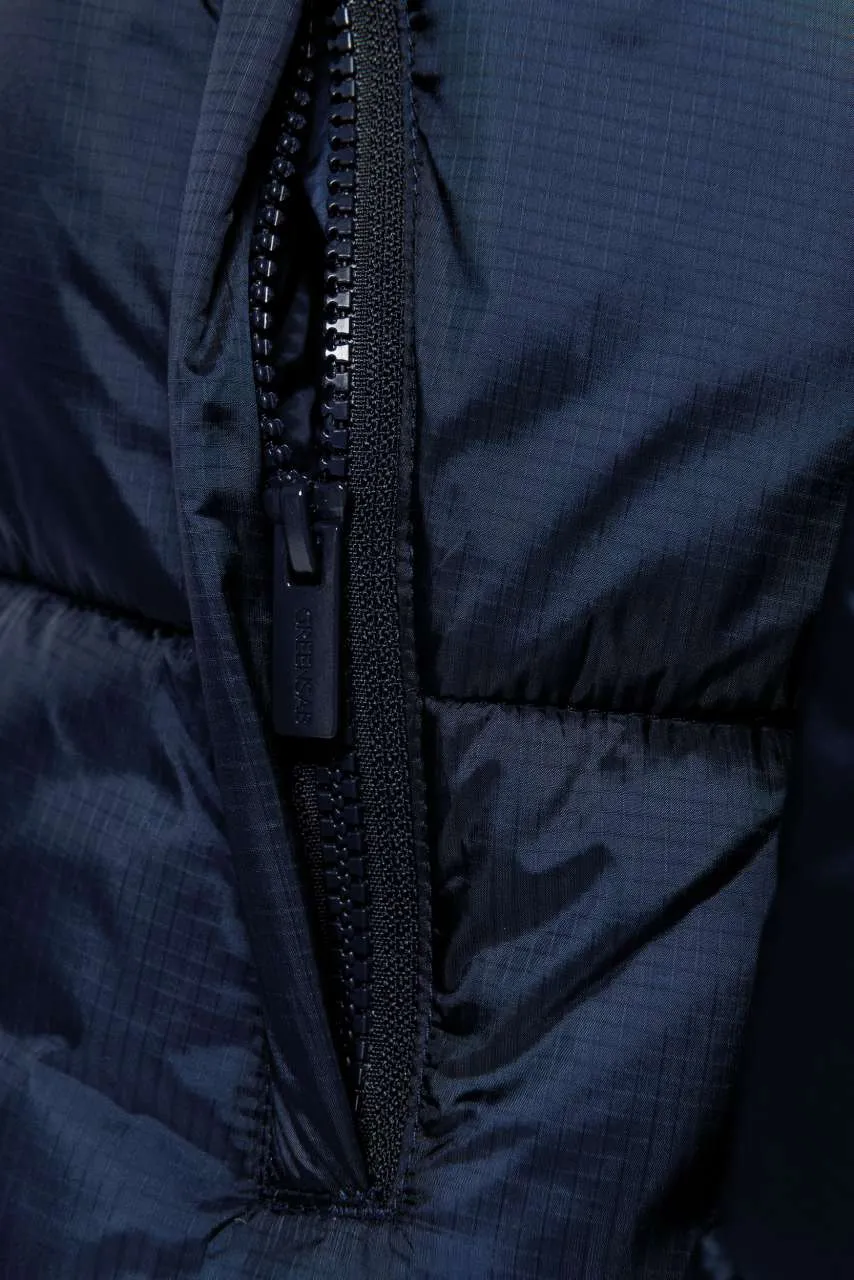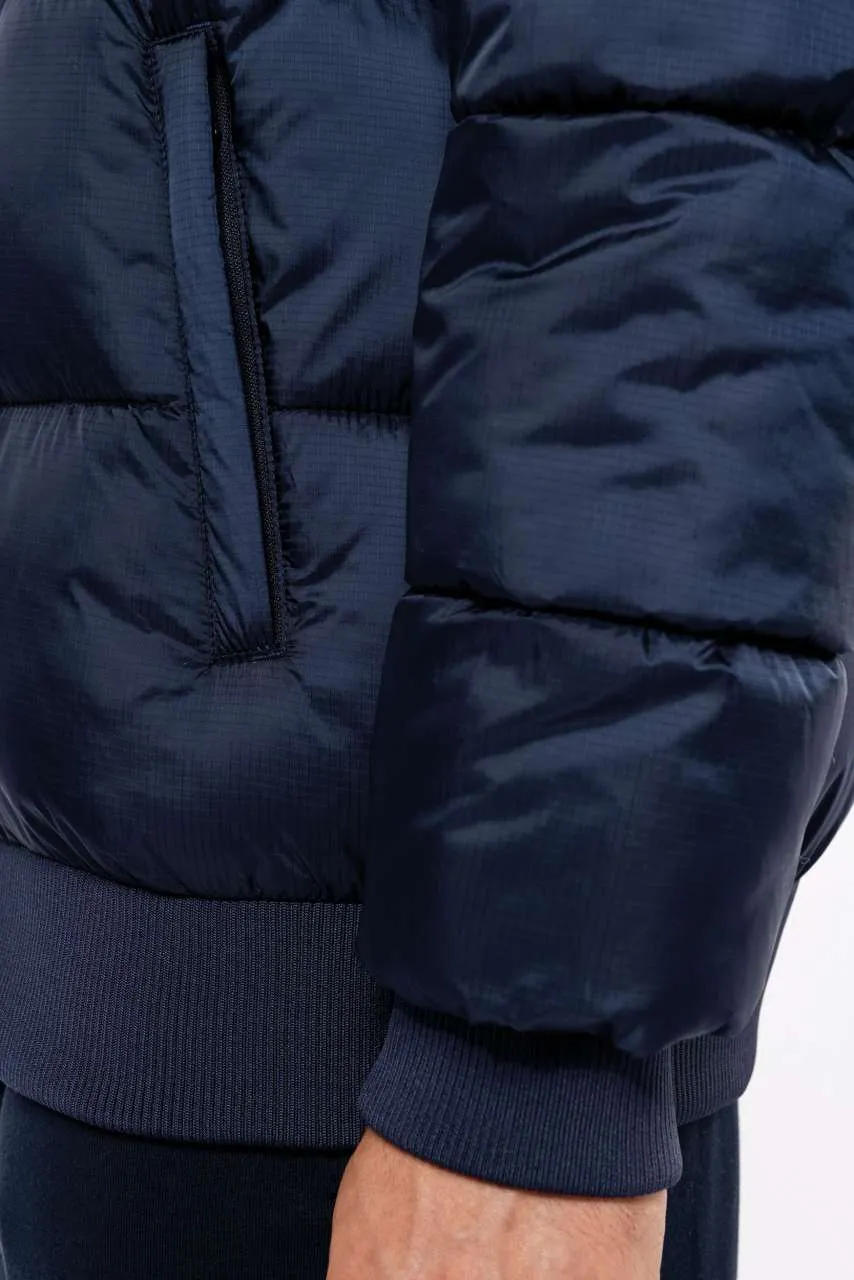 100% recycled ribstop 380T polyamide Water-repellent fabric 100% recycled polyester inner trim Lined in 100% recycled polyamide Straight fit 2 zipped and piped side pockets 1 inside patch pocket with tear release fastening Front zip fastening Stand-up collar with a lined, padded and adjustable 3-part hood with stopper Ribbed cuffs and bottom hem Invisible inner zip on the left-hand side and at the bottom hem for decoration access