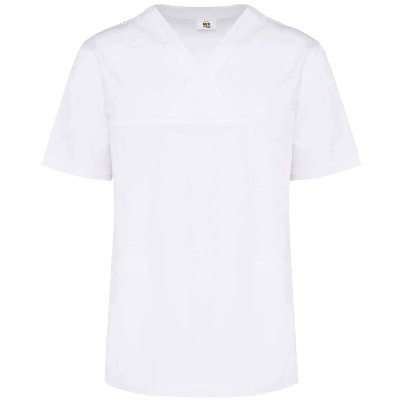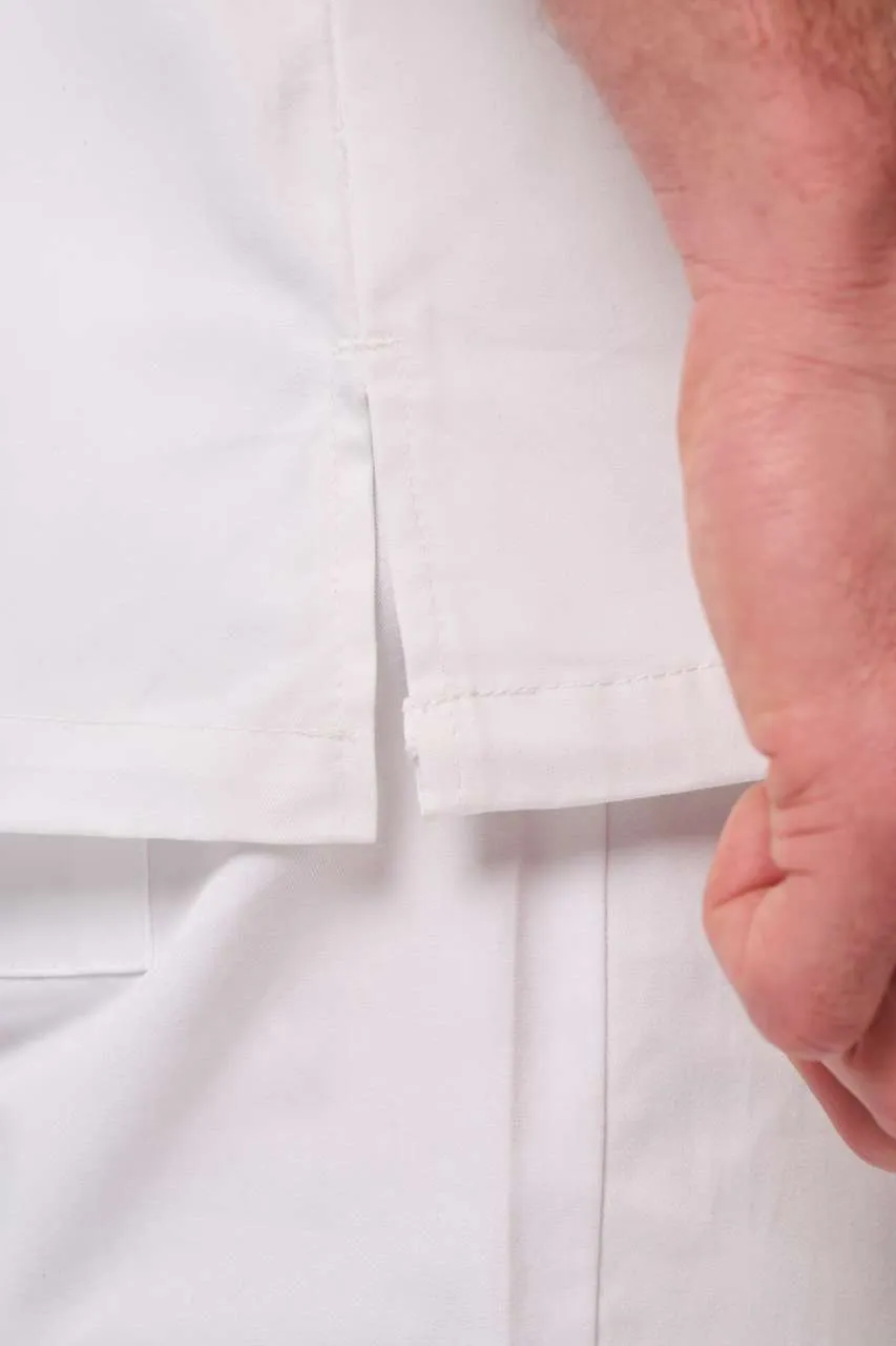 100% cotton Twill fabric Regular fit Crossed V-neck Patch chest pocket on the left-hand side 2 large patch pockets on the front 2 slits at the side Name tag inside the garment Tear-away brand label
