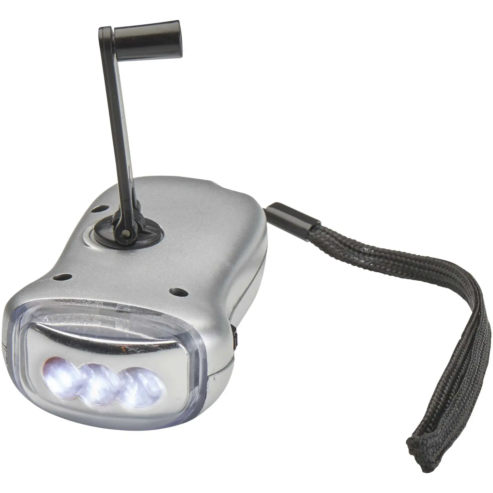 Compact solar torch with a brightness of 10.000 mcd. The torch can also be powered manually by turning the handle.